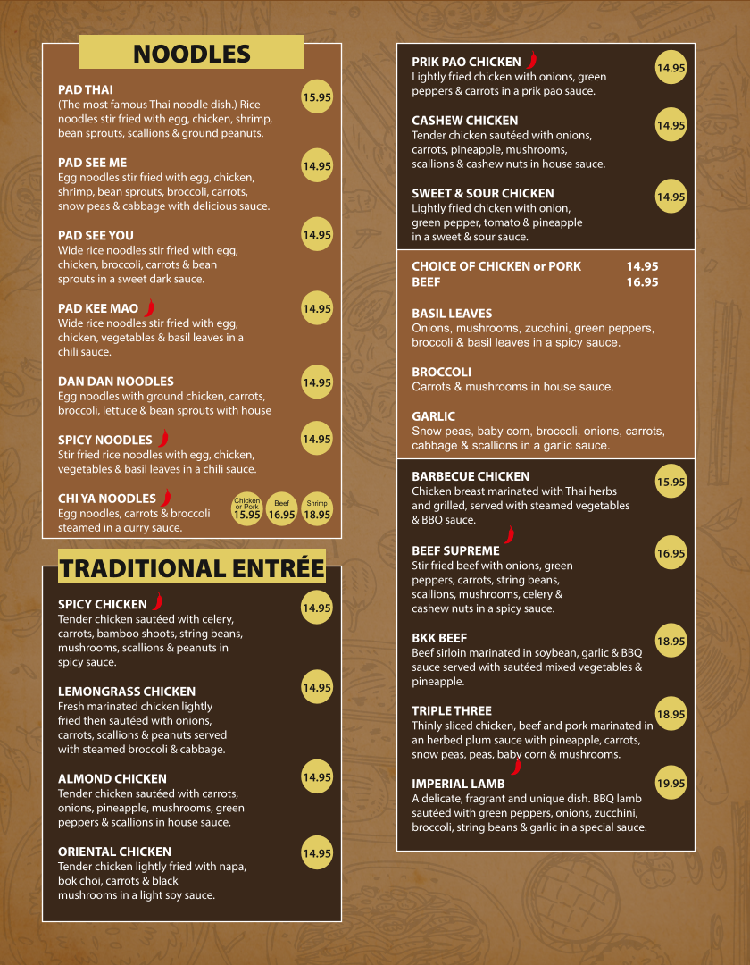 At Thai House Restaurant, the array of curry dishes stands out as true highlights of the menu. The Red Curry, enriched with bamboo shoots, carrots, and a dash of basil, is a masterpiece priced at just $14.95. Meanwhile, the MASSAMAN CURRY showcases a delightful mix of roasted peanuts and vegetables, enticing diners with its rich flavors. The unique SQUASH CURRY, with tender chicken sautéed in a red curry sauce, presents an excellent blend of textures and tastes that is simply unforgettable.
